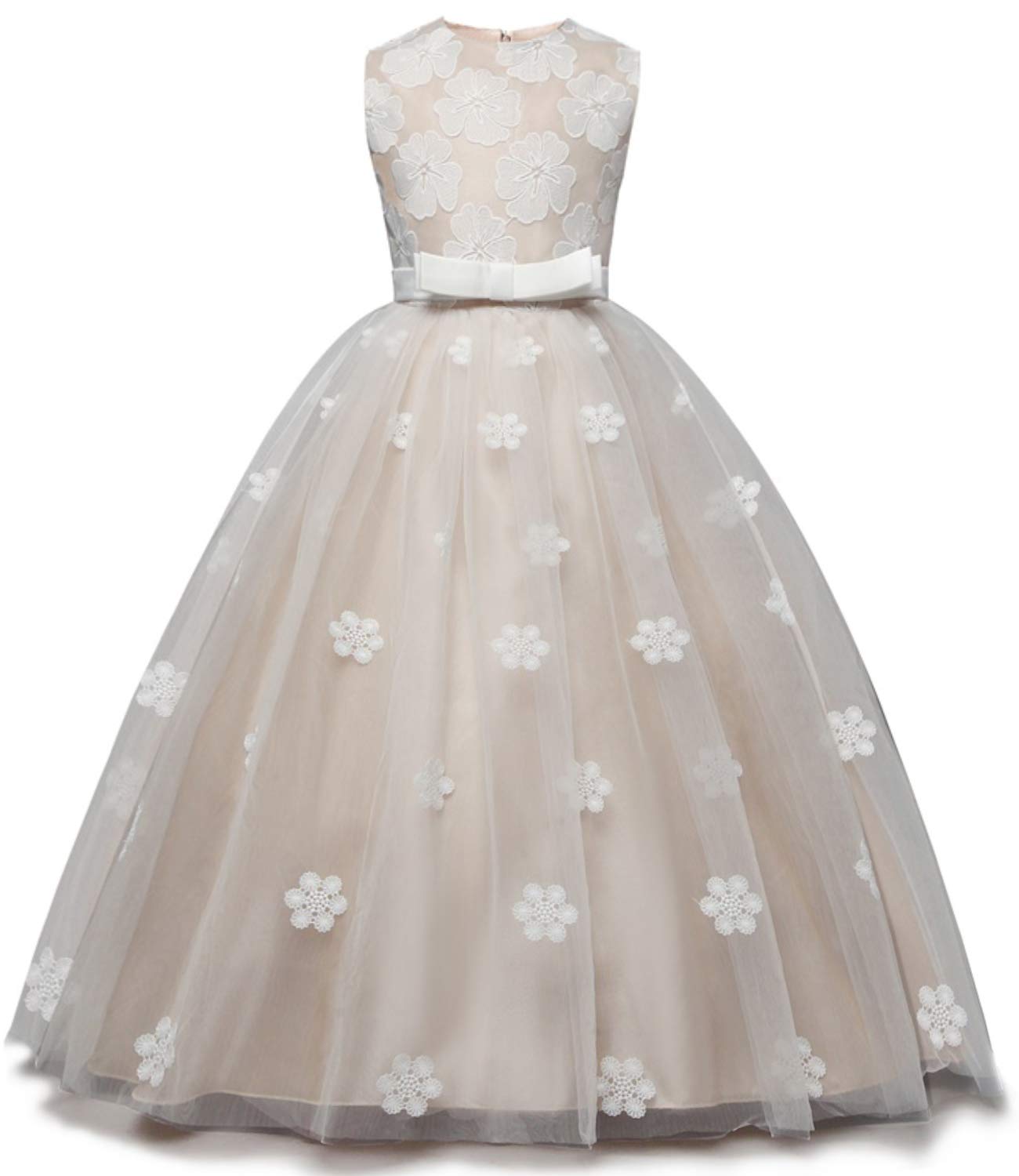 - Senza maniche e girocollo. Disegno a "V" sul retro e cerniera nascosta. Un fiocco realizzato in tessuto satinato è in vita. Fiore bianco ricamato cucito su tutto il vestito. Sembra elegante e beatuful.Questo abito si adatta perfettamente a qualsiasi festa di nozze come un vestito ragazza di fiori o può essere al centro del palco durante qualsiasi servizio fotografico in stile.
