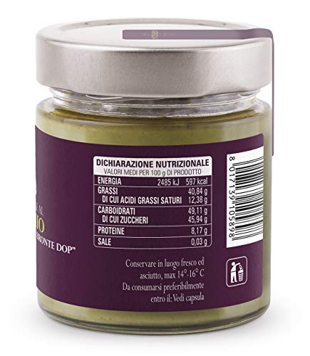 DescrizioneCrema spalmabile al pistacchio con pistacchio verde di Bronte DOP; l'eccellenza della crema al pistacchio, preparata utilizzando il pregiato pistacchio coltivato in Sicilia nel territorio di Bronte e certificato dall'omonimo consorzio.IngredientiPistacchio Verde di Bronte dop 45%, zucchero,latte in polvere, olio extra vergine d'oliva, grassi vegetali non idrogenati (olio di semi di girasole, burro di cacao),emulsionante : lecitina di Soia.