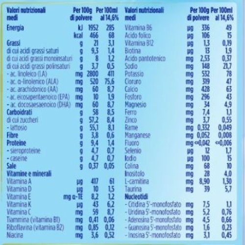 DescrizioneFormula brevettata di ultima generazione:IngredientiLattosio, oli vegetali (palma, cocco, colza a basso contenuto di acido erucico, girasole), latte scremato in polvere, siero di latte demineralizzato (in polvere), galatto-oligosaccaridi da latte (in polvere) 8,6%, concentrato di sieroproteine da latte, frutto-oligosaccaridi 0,6%, fosfato di calcio, olio di pesce, sieroproteine da latte, cloruro di potassio, citrato di potassio, idrogenofosfato di magnesio, olio estratto da Mortierella alpina, carbonato di calcio, cloruro di colina, citrato di sodio, acido L-ascorbico, emulsionante: lecitina di soia, cloruro di sodio, taurina, inositolo, cloruro di magnesio, solfato ferroso, L-triptofano, sodio L-ascorbato, L-carnitina, solfato di zinco, citidina 5'-monofosfato, uridina 5'-monofosfato sale sodico, antiossidante: ascorbil palmitato, adenosina 5'-monofosfato, inosina 5'-monofosfato sale sodico, nicotinamide, calcio D-pantotenato, acetato di DL-α-tocoferile, guanosina 5'-monofosfato sale sodico, solfato rameico, DL-α-tocoferolo, palmitato di retinile, riboflavina, cloridrato di tiammina, cloridrato di piridossina, ioduro di potassio, acido folico, solfato di manganese, fitomenadione, selenito di sodio, colecalciferolo, D-biotina, cianocobalamina.IndicazioniPer la salute del tuo bambino ti consigliamo di seguire attentamente i consigli per una corretta igiene: 1) Prima della preparazione accertarsi che l'ambiente in cui si opera sia pulito e lavarsi ed asciugarsi bene le mani 2) Sterilizzare biberon, tettarella e ghiera. Se non si ha a disposizione uno sterilizzatore farli bollire in acqua 3) Tenere la pentola e gli oggetti sterilizzati chiusi con il coperchio fino al momento di utiizzo degli stessi. Prestare attenzione nel manipolare gli oggetti caldi 4) Fare bollire in un contenitore pulito la quantità d'acqua potabile necessaria per la ricostituzione del prodotto 5) Versare l'acqua tiepida nel biberon sterilizzato seguendo le indicazioni riportate nella tabella media di alimentazione 6) Aggiungere i misurini rasi di polvere secondo le indicazioni della tabella media di alimentazione utilizzando solo il misurino contenuto nella confezione 7) Chiudere il biberon e agitarlo per far sciogliere la polvere 8) Una volta pronto il prodotto testare la temperatura sul polso e somministrare al lattante. Consumare entro mezz'ora dalla preparazioneAvviso di sicurezzaCONSIGLI PER L'UTILIZZO: - si raccomanda di preparare il latte solo al momento del pasto e di consumarlo entro 2 ore - Non riutilizzare l'eventuale latte avanzato dopo il pasto. - Non riscaldare o bollire il latte una volta preparato.Visualizza di più