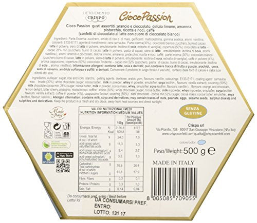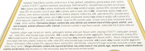 DescrizioneConfetti di cioccolato al latte ripieni di cioccolato biancoIngredientiCONFETTI DI CIOCCOLATO AL LATTE CON CUORE DI CIOCCOLATO BIANCO AI GUSTI ASSORTITI - Ingredienti: cioccolato al LATTE (50%) (zucchero, burro di cacao, LATTE in polvere, pasta di cacao, siero di LATTE, emulsionante: lecitina di SOIA, aromi: vanillina); cioccolato bianco (30%) (zucchero, burro di cacao, LATTE in polvere, siero di LATTE in polvere, emulsionante: lecitina di SOIA, estratto di vaniglia); zucchero; amido di riso e di mais, gelificanti: maltodestrina, gomma arabica; coloranti: E133 – E171; agente di rivestimento: cera carnauba; aromi: arancio e cioccolato, delizia limone, amarena, pistacchio, ricotta e noci; aromi: vanillina. Cacao 28% min. CONFETTI DI CIOCCOLATO FONDENTE E CIOCCOLATO AL LATTE CON ESTRATTO CAFFE' CON CUORE DI CIOCCOLATO BIANCO - Ingredienti: Cioccolato Fondente e cioccolato al latte con estratto caffè (50%) (pasta di cacao, zucchero, burro di cacao, LATTE intero in polvere, LATTOSIO, caffè estratto in polvere (max 3 %), lecitina di SOIA, vanillina); cioccolato bianco (30%) (zucchero, burro di cacao, LATTE in polvere, siero di LATTE in polvere, emulsionante: lecitina di SOIA, estratto di vaniglia); zucchero; amido di riso e di mais; gelificanti: maltodestrina, gomma arabica; coloranti:E133 - E171; agente di rivestimento: cera carnauba; aromi: vanillina. Cacao min.52%Indicazioni-Avviso di sicurezza-Visualizza di più