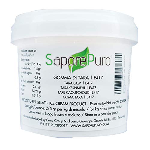 Addensante naturale (E417) ottenuto dall’endosperma macinato dei semi di Caesalpinia spinosa, una pianta della famiglia delle Leguminose. Ideale per gelati e sorbetti, funziona anche a freddo. La farina di semi di tara può essere utilizzata come sostituta della farina di semi di carrube e della gomma di guar. Ha inoltre una buona stabilità nel processo di congelamento e scongelamento, con un ridotto rilascio d’acqua: è indicata, perciò, nella preparazione dei gelati perché riduce al minimo la formazione dei cristalli di ghiaccio. E’ importante sapere che la gomma di Tara non copre il sapore, l’aroma e non modifica il colore degli alimenti in cui viene inserita (a differenza di atri addensanti), ma lo fortifica.