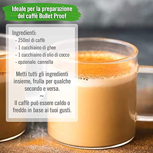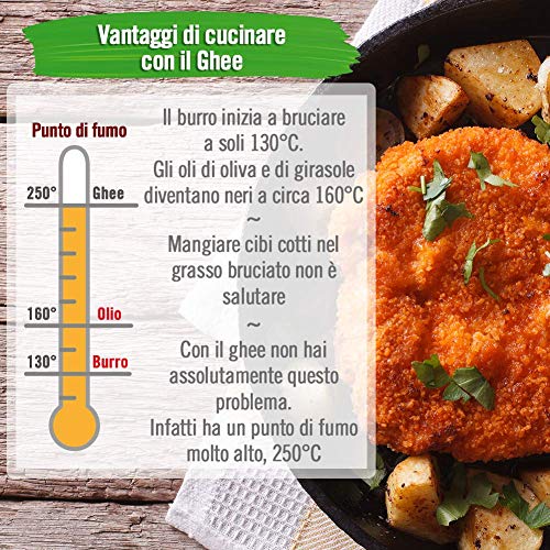 - PROPRIETÀ - Ricco di grassi a catena corta, di vitamine A,D,E,K, di antiossidanti K2 e CLA (acido linoleico coniugato) il Ghee favorisce l’assorbimento del ferro e dei nutrienti, è riequilibrante per il fegato e riparatore per l’intestino.Ha forti proprietà di difesa delle cellule ed antietà. È un prodotto curativo e fortificante, fonte di energia e benessere, ideale nella dieta di anziani, studenti, sportivi, bambini e donne in gravidanza. Un superfood perfetto per gli intolleranti al lattosio.