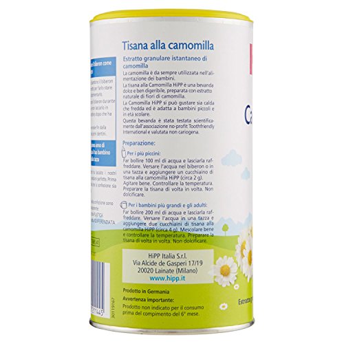 DescrizioneGrazie all’utilizzo di isomaltulosio, un carboidrato naturale che non crea acidificazione nella bocca, la Tisana alla Camomilla HiPP è “Amica dei Denti” perché non danneggia i dentini dei bambini e favorisce la salute orale. Per questo le tisane con isomaltulosio HiPP sono contrassegnate dal simbolo Toothfriendly International, che ne certifica la non cariogenicità.IngredientiIsomaltulosio , estratto di camomilla.IndicazioniPer i più piccini: far bollire 100 ml di acqua e lasciarla raffreddare. Versare l’acqua nel biberon o in una tazza e aggiungere un cucchiaino di tisana Camomilla HiPP (circa 2 g). Agitare bene. Controllare la temperatura. Preparare la tisana di volta in volta. Non dolcificare. Per i bambini più grandi e gli adulti: far bollire 200 ml di acqua e lasciarla raffreddare. Versare l’acqua in una tazza e aggiungere due cucchiaini di tisana Camomilla HiPP (circa 4 g). Mescolare bene e controllare la temperatura. Preparare la tisana di volta in volta. Non dolcificare.Avviso di sicurezza-Visualizza di più