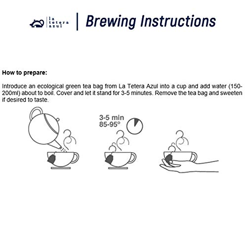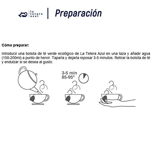 Tè verde biologico & nbsp; - La Tetera Azul Scopri il delizioso sapore del tè verde con menta piperita al 100% Teiera blu biologica. Deliziosa infusione di tè verde con menta della migliore qualità con certificazione ecologica e del commercio equo e solidale. Ogni confezione di tè verde biologico di La Tetera Azul contiene 100 sacchetti filtro da 1,5 g. peso netto, carta da filtro piegata con filo di cotone ed etichetta cucita. Ogni sacca per infusione è presentata in una busta termosaldata. Tutte le infusioni di La Tetera Azul sono sottoposte a severi controlli di qualità, in modo da goderne tutto l'aroma e il sapore, senza deteriorare o adulterare il materiale. cugino. Ingredienti: Tè verde con menta piperita Caratteristiche: Senza glutine, adatto per celiaci Senza zucchero, adatto per diabetici Senza lattosio, adatto per intolleranti al lattosio Non & nbsp; geneticamente modificato Adatto a vegani e vegetariani Come preparare: Presentare una bustina di tè verde biologico da La Tetera Blu in una tazza e aggiungere acqua (150-200 ml) per far bollire. Coprilo e lascia riposare per 3-5 minuti. Rimuovere la bustina di tè e dolcificare se si desidera avere un sapore.