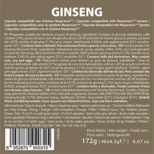 Descrizione Caffè al ginseng istantaneo in capsule, compatibili con macchine Nespresso, 4,3 g x 40. Ingredienti Dehydrated glucose syrup, soluble coffee (23%), non-hydrogenated coconut fat, flavorings, MILK enriched with fat in powder, MILK proteins, ginseng extract (1.7%), low-fat cocoa, stabilizer: E340 (ii) ; anti-caking agent: E551; emulsifier: E471