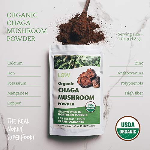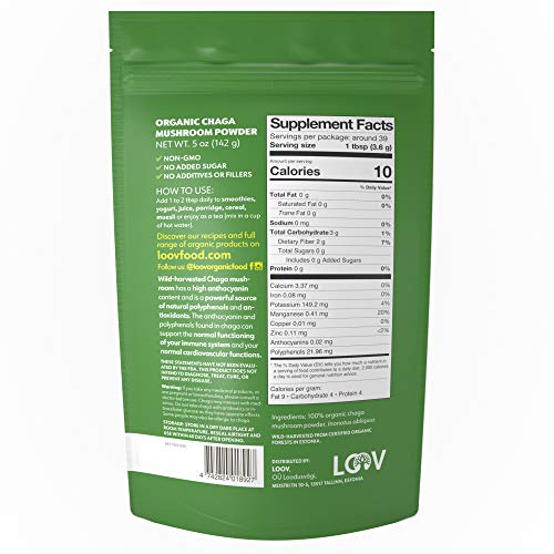 - I FUNGHI CHAGA DI LOOV VENGONO RACCOLTI IN AUTUNNO E INVERNO, QUANDO IL LORO VALORE NUTRIZIONALE È PIÙ ALTO. Il Nord Europa offre condizioni ideali per la crescita del fungo chaga. L'inverno è freddo, buio e lungo, e il fungo prospera nelle lunghe notti d'estate. Per sopravvivere al rigido clima nordico il fungo assorbe vari composti naturali e quindi ha un effetto molto forte. Considerato che la nostra polvere non viene scaldata, è un alimento crudo e tutti i suoi nutrienti vengono preservati.