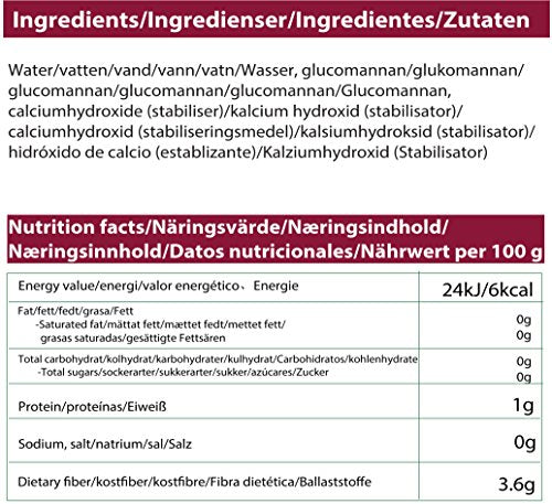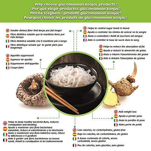 - PURE PASTA È ANCHE IDEALE PER DIMAGRIRE, IPOCALORICO, BASSO IN CONTENUTO DI CARBOIDRATI, É RICCO DI FIBRE. Dimagrisci mangiando questa farina di Konjac che è quasi senza carboidrati e soltanto ha 6 calorie pero ogni 100 grammi. Questo è veramente incredibile. Anche, pero la sua capacità di assorbire l’acqua soddisfà l’apetitto e fornisce una buona quantità di fibre che aiuta a mantenere un sistema digerente sano