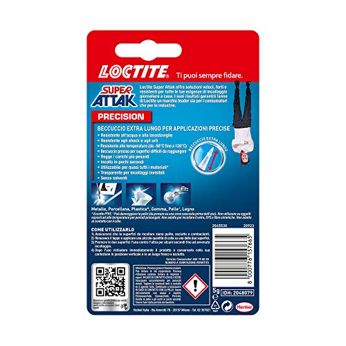 Loctite Super Attak Precision 5g – Adesivo universale istantaneo per applicazioni precise Stai cercando una colla per incollare quelle zone strette, difficili da raggiungere? Quello che ti serve è un adesivo resistente che sia al tempo stesso pulito e preciso? La colla Loctite Super Attak Precision 5g è pensata proprio per questi utilizzi! Offre una forza istantanea, una tecnologia liquida trasparente e un tappo con ago anti-otturazione, per garantire risultati durevoli ed incollaggi invisibili. Grazie allo speciale beccuccio extra lungo, questa colla resistente è facile da usare e raggiunge anche le superfici più strette e difficili da incollare. È adatta a diversi materiali – dal legno alla gomma, dalla plastica alla ceramica, e molto altro*. L'adesivo istantaneo non solo resiste a carichi pesanti, ma anche alle temperature estreme, all'acqua, agli shock e agli urti, rendendo possibili una varietà di incollaggi. Quando sei pronto ad incollare, assicurati che le superfici siano asciutte e pulite da polvere o sporco. Poi rimuovi il tappo e applica una piccola quantità di colla su una superficie, esercitando una leggera pressione sul flacone. Tieni premute le due superfici l'una contro l'altra finché non saranno ben incollate. Facile! Vantaggi del prodotto: Per applicazioni precise in posti difficili da raggiungere Beccuccio extra lungo e preciso Tappo anti-otturazione e anti-goccia Non secca e non cola Incolla in pochi secondi Multi-materiale: metallo, ceramica, pelle, gomma, legno, plastica* Resistente ad acqua, lavastoviglie, urti e temperature estreme Formula: cianoacrilato liquido Colore: trasparente Formato: 1 flacone da 5g *Tranne PE, PP, PTFE, gomma siliconica, vetro o superfici vetrificate