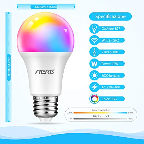 Aerb lampadina smart wifi E27,Lampadina Wi-Fi Intelligente LED 9W 1000LM Multicolore Dimmerabile 2700k-6500k+RGB+CCT Equivalente 60W Bulbo Compatibile con Alexa/Google Assistant e IFTTT 2 Pezzi [Classe di efficienza energetica A+]