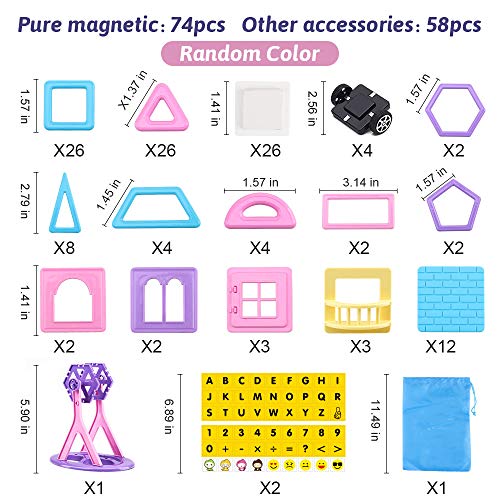 - Questo set di sviluppo di giocattoli per castello magnetico STEM ha 132 pezzi (74 pezzi di accessori magnetici), include 26 * quadrati, 26 * triangolo, 26 * carte bianche, 4 * ruote, 2 * esagono, 8 * triangolo isoscele, 4 * trapezio, 2 * Pentagono, 4 * Semicerchio, 2 * Rettangoli, 1 * Ruota panoramica a otto pezzi, 2 * Adesivi , 22 * Valutazioni non magnetiche, 1 * Bella confezione regalo, 1 * Manuale a colori con molti modelli di riferimento , 1 * Borsa