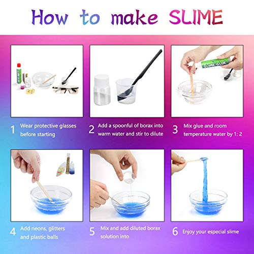 ❥Per creare il vostro proprio Slime. ❥Trasformare i fluidi schifosi con il nostro laboratorio di slime fai-da-te farà sentire i tuoi figli scienziati di fama mondiale che conducono esperimenti segreti! Sei ancora preoccupato per la mancanza di gioia nel tempo della famiglia o della festa? ✔Con la sua elasticità e morbidezza, il kit slime porterà piacere ad una vita noiosa. Sei ancora preoccupato di dare qualcosa dei regali per tuo figlio? ✔Il nostro set di melma è un regalo decente e ideale per ragazzi e ragazze, anche per adulti! Sei ancora preoccupato di come comunicare con i tuoi figli? ✔Slime manterrà il rapporto tra voi e i vostri figli! ❥Materie prime: acqua, PVA, glicerolo, pigmento, bicarbonato di sodio(concentrazione ❥Come preparare il slime: 1, indossare occhiali di sicurezza prima di iniziare. 2, aggiungere un cucchiaio di bicarbonato di sodio in circa 40 ml di acqua calda in una tazza e mescolare per diluire. 3, mescolare 1 tubo di colla (50 ml) e 2 misurini (100 ml) di acqua a temperatura ambiente di 1: 2 in un contenitore. 4, aggiungi neon, glitter e palline di plastica. 5, mescolare e aggiungere la soluzione diluita Bicarbonato di sodio nel misurino. 6, goditi il tuo slime speciale. ❥Contenuto della Confezione: 4 x tubetti di colla 6 x coloranti che 2 x bottiglie di bicarbonato di sodio 3 x confezioni di glitter 1 x occhiali 1 x sacchetto di polvere fluorescente 6 x bastoncini di legno 2 x cucchiai di plastica 1x misurino 1 x sacchetto di palline colorate ❥Avviso caldo: - Se il colorante nel pacco ricevuto perde, si prega di contattare il venditore Ucradle per la sostituzione. - Questo gioco è adatto per bambini da 6 anni in su con supervisione di un adulto -Solo per giocare, non commestibile.