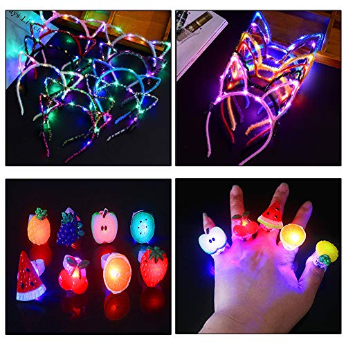 - 20 PEZZI GIOCATTOLI LAMPEGGIANTI LED: 5 pezzi di orecchie da coniglio a led / 5 pezzi di orecchie da gatto lampeggianti / 10 pezzi di anelli luminosi per forniture per feste di compleanno e accessori quotidiani, fascia con tonnellate di luci a LED in miniatura avvolte, bling, accattivante con una taglia adatta sia per bambini che per adulti