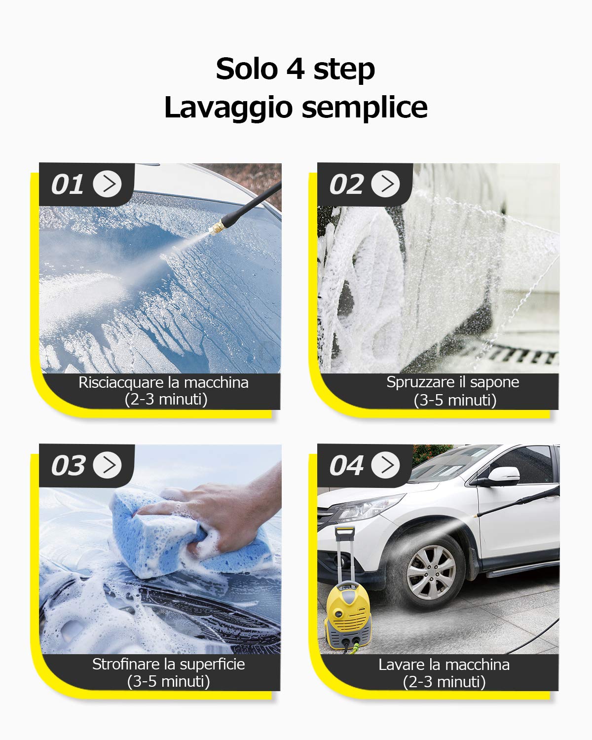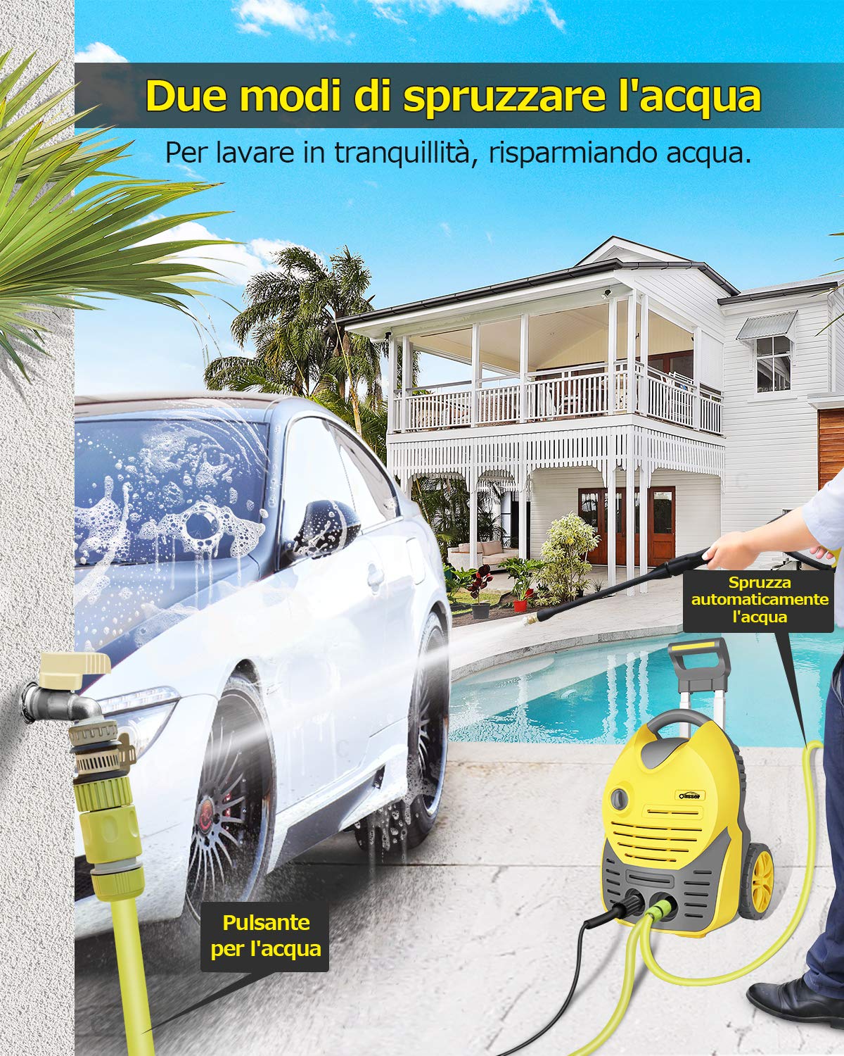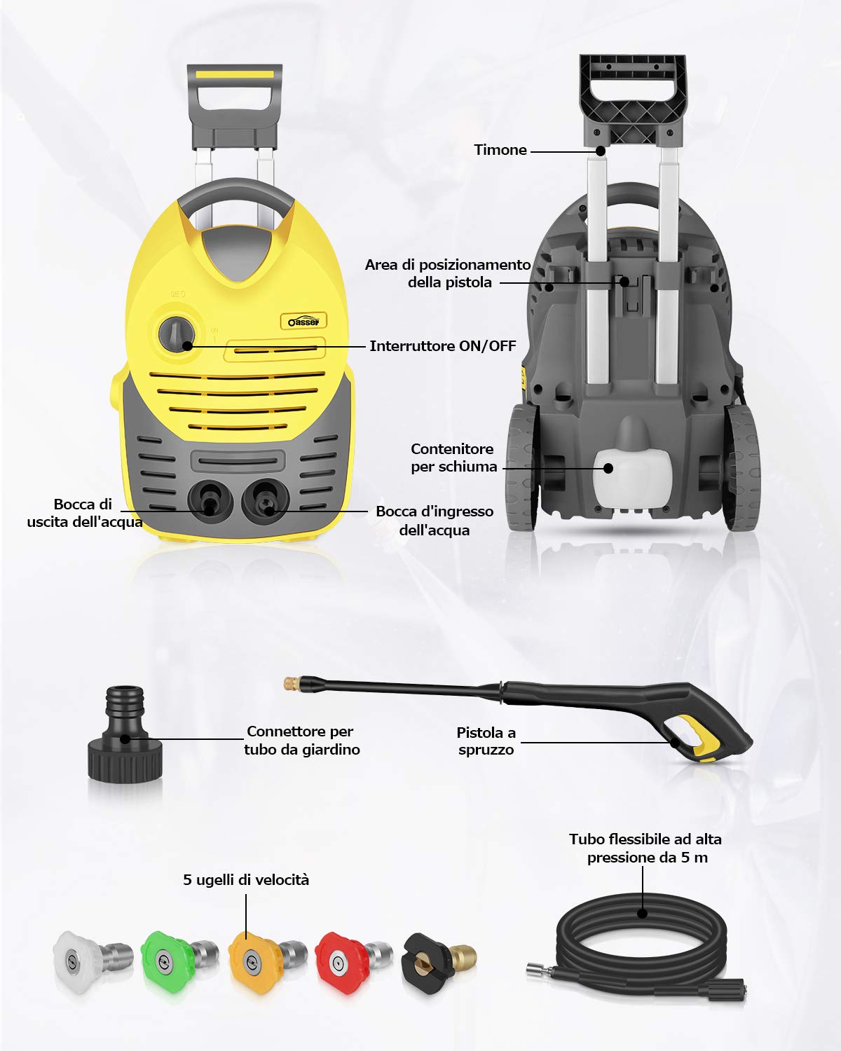 - Accessori Ricchi: Dotato di tubo flessibile ad alta pressione 5m, vaschetta per schiuma da 200 ml incorporata, se necessario è possibile utilizzare del detergente. 5 ugelli di spruzzo Quick-Connect (0º, 15º, 25º, 40º e sapone) per le attività di pulizia leggere, medie e più impegnative