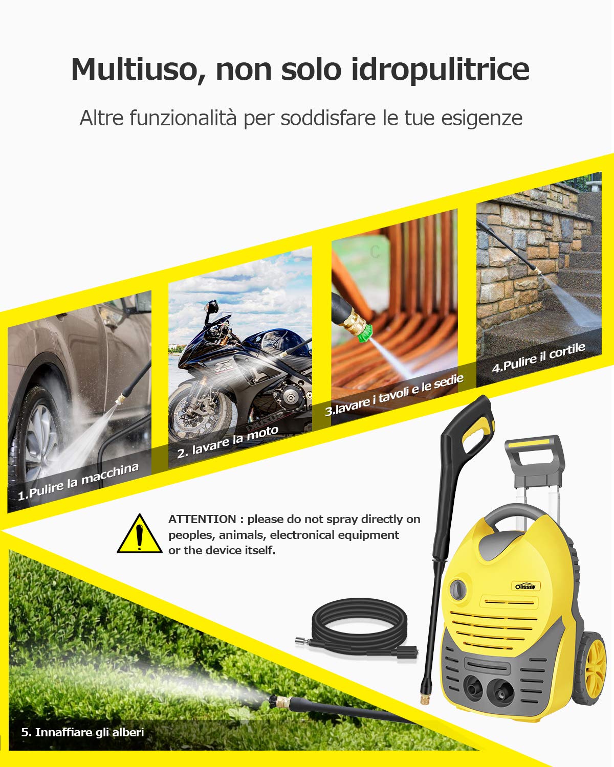 * Il motore dell'idropulitrice da 1600 Watt può fornire la massima pressione di esercizio di 140 bar e la massima efficienza di pulizia di 420L/h.