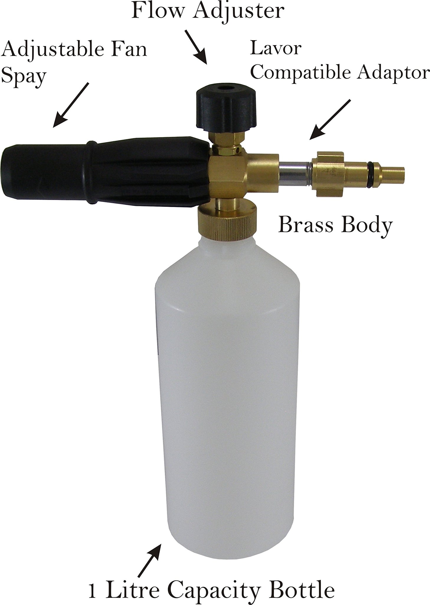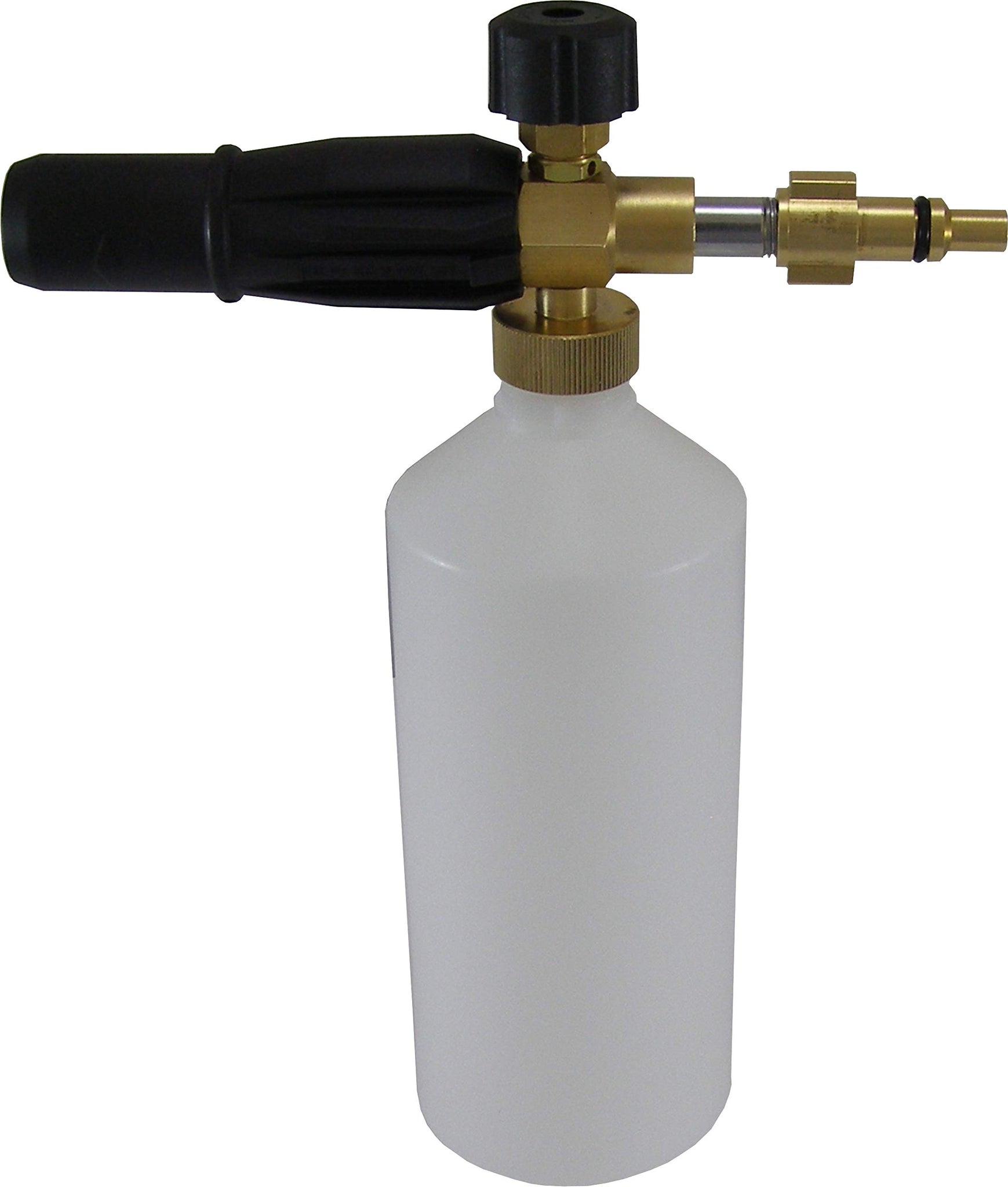 Schiuma per idropulitrice. Accessorio molto apprezzato, adatto alla maggior parte delle idropulitrici a pressione. Produce uno spesso strato di schiuma che può essere poi semplicemente lavata con la tua idropulitrice standard. Pressione: 80 bar. Temperatura max: 60 °C (serbatoio da 1 litro).