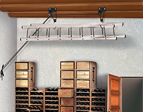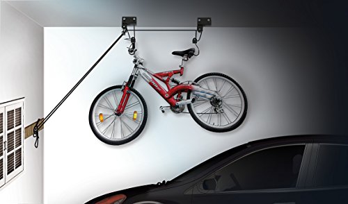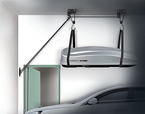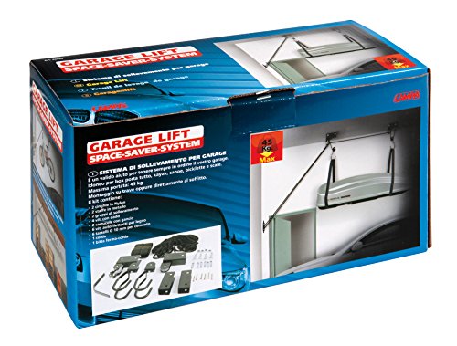 Sollevatore garage lift. Sistema di sollevamento per garage. È un valido aiuto per tenere sempre in ordine il garage. Idoneo per box porta tutto, kayak, Canoe, biciclette e scale. Massima portata: 45 kg. Montaggio su trave oppure direttamente al soffitto. Kit di montaggio incluso.