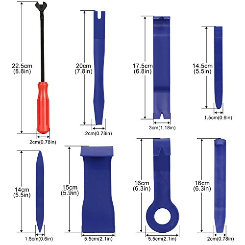 - Ampia applicazione e versatile: è possibile ottenere un sacco di lavoro con solo 8 versatile strumenti: taglio e rimozione di Car Audio/radio, pannello porta, finestra, interni, accessori, Bicycle Tire, stampaggio, ecc. Si tratta di una sorta di un must-have Tool Kit per casa.