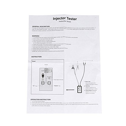 Spiegazione per 4 modalitàModalità 1: il tester uscite 1 Pulse, la cui Larghezza di impulso è di circa 250 MSModalità 2: il tester emette 50 Pulse, Pulse width di ogni impulso è di circa 7 msModalità 3: il tester emette 100 Pulse, Pulse width di ogni impulso è di circa 3.5 MSModalità 4: il tester emette impulsi continuamente al ritmo di 50 impulsi per circa 1450 MS, larghezza di impulso di ogni impulso è di circa 7 ms all-sun em276 iniettore tester istruzioni per l' uso:spegnere il motore del veicoloCollegare nero/rosso clip al negativo/positivo terminale della batteriaPer collegare il terminale di uscita impulsi iniettoripremere il tasto per selezionare la modalità "Set" desiderata Pulse Modepremere il tasto "Pulse, em276 tester emettono il Pulse per l' iniettore, e poi il polso segnale indicatore si accende come indicazione all-sun em276 SpecificheAlimentazione: batteria 12 V del veicoloAmbiente di funzionamento: 0 ℃ - 40 ℃, umidità relativa < 80%Ambiente di stoccaggio: -10 ℃ - 50 ℃, umidità relativa < 85%Dimensioni: 147 x 82 x 29 mm (corpo principale solo)Peso: circa 165 g Il pacchetto include:1PC x carriable borsa1PC x manuale di istruzioni1PC x non include le batterie