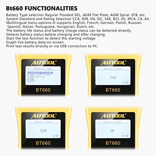 - Molteplici tipi di batterie: veloce e preciso sistema di spunto a freddo. Il tester per batterie BT660 viene usato su auto, camion, moto, barche, tosaerba. Consente di diagnosticare lo stato di salute della batteria senza scollegarla.