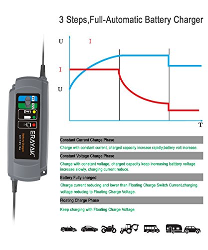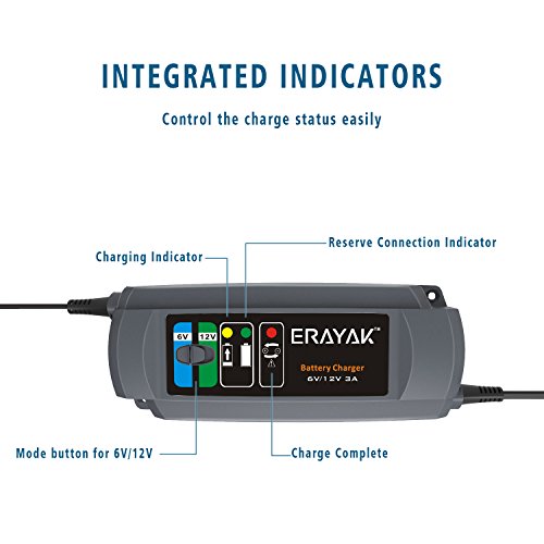 ERAYAK 3.0A 6V/12V Caricabatterie Carica Batteria per Auto e Moto Automatico Mantenitore di Carica Mantenitore Batteria per Batteria al Piombo Acido 80Ah, Maintenance-Free, CA-CA, AGM e Gel
