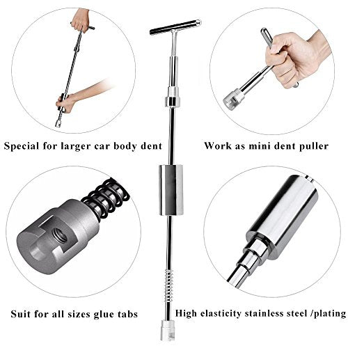 Come funziona il kit per riparazione dalle ammaccature?1. Pulire lo strumento con un panno pulito umido.2. Inserire la cartuccia di colla all'interno della relativa pistola, premere il grilletto per caricare la pistola, collegarla a una fonte di energia e lasciarla riscaldare per 5 minuti.3. Utilizzare una guarnizione di estrazione adeguata. Per un estrattore di grandi dimensioni occorre una guarnizione altrettanto larga. (Nota: più la guarnizione per l'estrazione è ampia, più elevata sarà la forza di estrazione).4. Tirare il grilletto e applicare la guarnizione per estrazione con la colla fuoriuscita (i 4 fori della guarnizione dovrebbero essere posizionati con la colla riscaldata e sciolta).5. Far aderire la guarnizione per estrazione con la colla riscaldata e sciolta al centro dell'ammaccatura, esercitare una leggera pressione fino a che la colla aderisce (lasciare raffreddare la colla per 8 minuti circa)6. Allineare lo strumento di riparazione a forma di T e premere la guarnizione con la colla riscaldata e sciolta, tirare l'asta scorrevole per sollevare l'estrattore.7. Controllare con una livella. Se l'ammaccatura non è scomparsa, battere leggermente la superficie interessata con un martello o una penna.Pulire l'area riparata con un panno pulito umido imbevuto di alcool.Qualsiasi problema, qualsiasi domanda, qualsiasi problema non esitate a contattarci.
