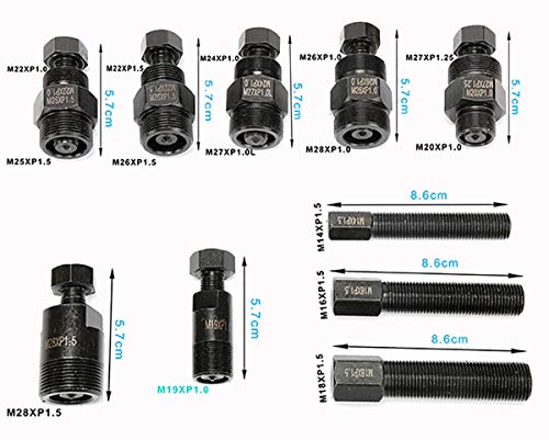10 pezzi, set di estrattori: Adatti per Yamaha, Honda, Suzuki, Bosch, Kawasaki, Ducati e molti altri marchi Dettaglio di Prodotto: - Doppio: M28 x 1,5 mm e M22 x 1,0 mm; M27 x 1,25 mm e M20 x 1,0 mm; M26 x 1,5 mm e M22 x 1,5 mm; M28 x 1,0 mm e M26 x 1,0 mm; M27 x 1,0 mm (filettatura sinistrorsa) e M24 x 1,0 mm; - un capo: M25 x 1,5 mm; M19 x 1,0 mm; M14 x 1,5 mm; M16 x 1,5 mm; M18 x 1,5 mm