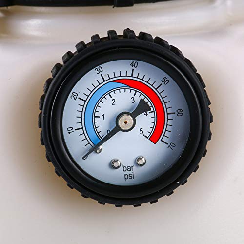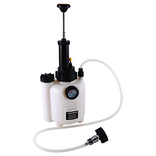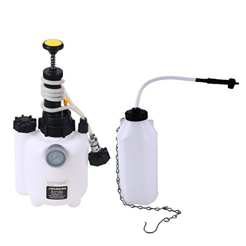 Specifiche tecniche: Materiale: plastica PE Pressione di esercizio: 2 bar / 30 psi Max. Pressione: 4,8 bar / 70 psi Capacità spurgo freni: 3L; ---- Capacità bottiglia: 1L Manometro 0-70psi (0 -5bar) con adattatore E20 Procedura di riempimento: 1. Assicurarsi che non rimanga pressione nel dispositivo. La pressione può essere rilasciata dalla valvola approvata sul lato della pompa. 2. Rimuovere il tappo sulla parte superiore dell'unità e riempire l'unità con nuovo liquido freni. Assicurarsi che non vi siano liquidi di scarto o corpi estranei nel serbatoio. Funzionamento: 1. Installare l'adattatore sul cilindro principale del sistema frenante. 2. Pompare la maniglia del dispositivo su e giù fino a raggiungere la pressione di spurgo consigliata. Aprire il nipplo del freno e collegarlo al serbatoio di sfiato appropriato. Quando vedi il nuovo liquido entrare nel contenitore, chiudi il capezzolo. Ripeti il processo su tutte e 4 le ruote (in qualsiasi ordine). 3. Quando il liquido dei freni scorre, chiedi a un aiutante di premere il pedale del freno mentre guardi il fluido che scorre attraverso il tubo trasparente. Più di qualche colpo può drenare il serbatoio del cilindro principale, quindi ricorda di continuare a controllarlo e riempirlo, se necessario.4. Al termine del processo, scaricare la pressione spingendo verso il basso la valvola di scarico sul lato della pompa. Dopo la disconnessione, scollegare il tubo di alimentazione del fluido dall'adattatore sul cilindro principale.