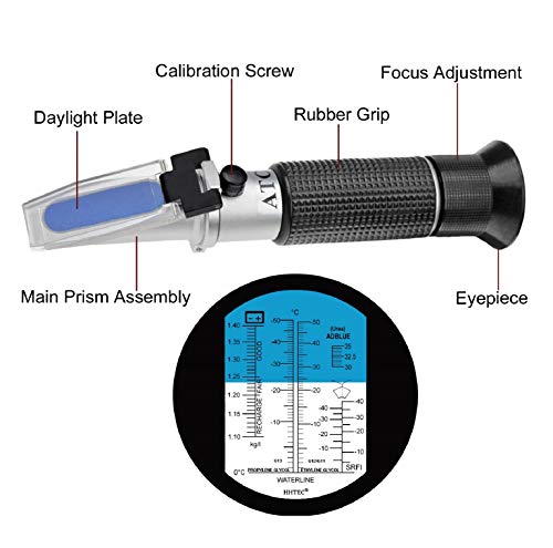 - UTILIZZO: Utilizzare questo refrattometro per misurare la concentrazione di etilene glicole e glicole propilenico dell'olio antigelo della vostra auto, del sistema solare, delle pompe di calore, del punto di congelamento dell'acqua di lavaggio del parabrezza, del sistema di riscaldamento o di altre macchine o impianti