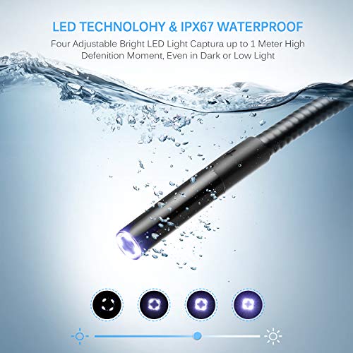 - Flessibile, impermeabile e LED: Impermeabilità IP67 con 8 mm di diametro della testa, che permette di osservare in zone di acqua. 4 LED Integrate regolabili, inoltre supporta quattro prospettive di conversione, facile a controllare le aree in ambienti scuri o bassa luce