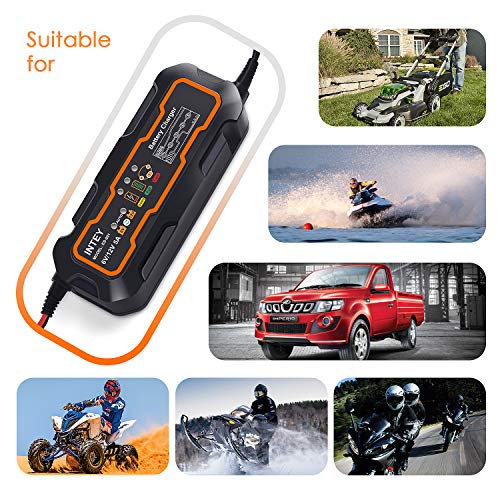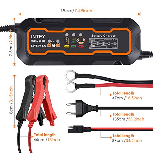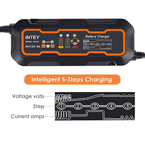 INTEY Batteria per auto, dispositivo per ricaricare batteria, caricatore per batteria auto Intey 6/12 V 5 A, caricatore per batterie di ciclomotori e furgoni, protezione invernale della batteria