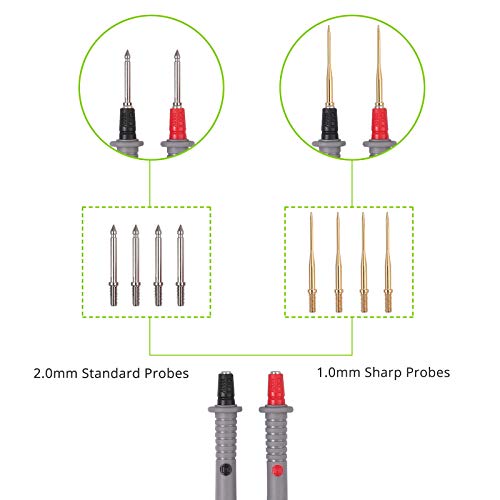 • Perni per Sonda da Test --- Include Extra 6PZ Sonde da Test, 4 dei Quali Sono Aghi Taglienti 1.0mm (Oro), 2 dei i Quali Sono Aghi Standard 2.0mm (Argento).