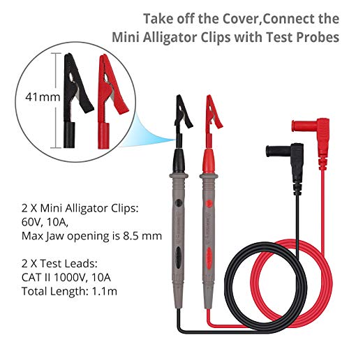• Mini Clip a Coccodrillo e Puntali --- La Corrente / Tensione di Entrata Massima di Loro sono 60V, 10A, L'Apertura Massima di Ganasce è 8.5mm. Puntali: CAT II 1000V, 10A. Mini Clip a Coccodrillo Si Possono Collegano con Sonda da Test.