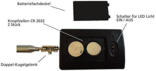 Telescopio - LED specchio strumentoSmart TV di specchio con illuminazione a LED - telescopico allungabile fino a 88 cm - 2 scomparto di giunto sferico - Impugnatura morbida antiscivoloMolto pratico assistente - Specchio telescopico con 2 strati di giunto a sfera e illuminazione a LEDSpecchio, specchio ultrapiatto di alta qualità - Con solo 10 mm Altezza - estensibile da 28 a 88 cmManico - Impugnatura morbida antiscivolo per una presa sicuraGiunto sferico - Due parallele snodi sferici per massima libertà di movimento'Ideal - permette di conoscere "dietro l' angolo, in ogni angolo - ideale anche per heizungsableser e GeocachingFunzionamento - con 2 X 2032Dimensioni - Lunghezza totale 285 - 875 mm - Specchio Mass 65 X 40 mm - Alloggiamento specchio 85 X 55 mm - Profondità 10 mm
