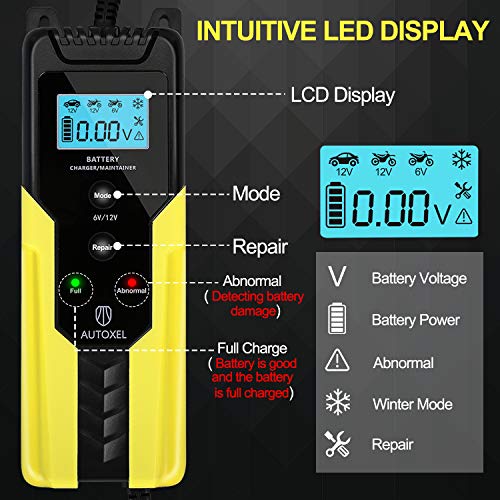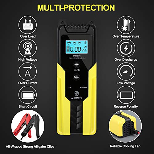 AUTOXEL Caricabatterie per Auto, 6V/ 12V 6A Carica Batteria Intelligente con Schermo LCD Multi Protezioni Riparazione e Mantenitore per Batterie AGM GEL MF di Moto, ATV, SUV, Barche a Motore, Tosaerba