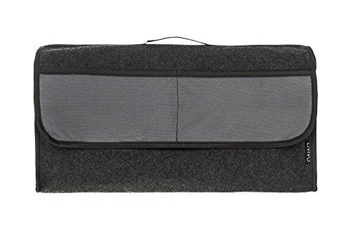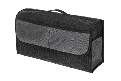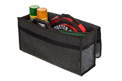 Taglia:large La borsa organizer per il bagagliaio offre una pratica ed efficace soluzione per riporre oggetti che altrimenti potrebbero rotolare in giro per il veicolo. È ideale per riporre attrezzi, accessori invernali come spray antighiaccio, raschietti e panni, manuali, mappe stradali e altri oggetti necessari per il viaggio e persino giocattoli per bambini. Prodotto con materiale resistente di colore grigio con bordo più scuro, è dotato di un gancio e cappio nella parte posteriore per aderire alla fodera del bagagliaio e di una linguetta per accedere facilmente al contenuto. La chiusura è abbastanza sicura da impedire alla borsa organizer e al suo contenuto di spostarsi mentre l'auto è in movimento.