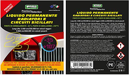 Descrizione Prodotto Azienda Cora, fondata nell'ottobre 1975, distribuisce accessori auto in tutta Italia avvalendosi di un'efficiente rete distributiva. Nel corso della sua lunga attività, l'azienda si è impegnata nella ricerca di prodotti che garantissero standard qualitativi sempre più elevati finalizzati a soddisfare le richieste dei consumatori esigenti. Tutto ciò con particolare attenzione alle risorse umane, alla logistica e all'informatica, in modo da garantire al consumatore un servizio rapido ed efficiente. Leggi di più Cora Liquido permanente radiatori e circuiti sigillati -35°C Pronto all'uso, già diluito in acqua demineralizzata. Formulato per i circuiti sigillati che impiegano in origine un liquido permanente di colore rosso. La formulazione, a base di glicole monoetilenico inibito, priva di nitriti e di ammine, protegge in modo particolare le parti in gomma e in plastica e ne prolunga la durata. Previene le incrostazioni e la corrosione delle parti metalliche. Assicura una lunga durata all'impianto di raffreddamento. Punto di congelamento: -35°C, punto di ebollizione: +107°C. Confezione: flacone da 2 lt. Leggi di più