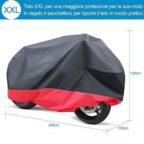 - Dimensioni: la dimensione della copertura per moto è XXL (265*105*125 cm), adatta per la maggior parte delle motociclette e dei veicoli elettrici (moto, scooter)