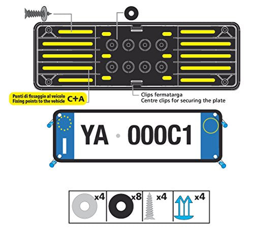 - Kit completo composto da portatarga, 4 rondelle in metallo, 8 distanziali in polipropilene, 4 viti autofilettanti, 4 bottoni di fissaggio azzurri