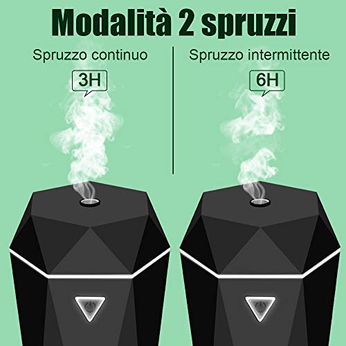 - 【Due modalità di spruzzatura】 Questo profumi auto per auto ha due modalità: irrorazione continua e spruzzo intermittente. È possibile passare da una modalità all'altra per controllare l'umidità o la concentrazione di fragranze. Dopo aver riempito diffusore auto con acqua, può funzionare per 4 ore in modalità continua e 6 ore in modalità intermittente (9 secondi acceso, 9 secondi spento).