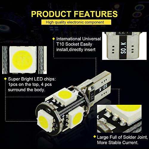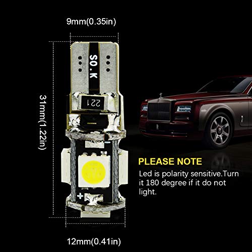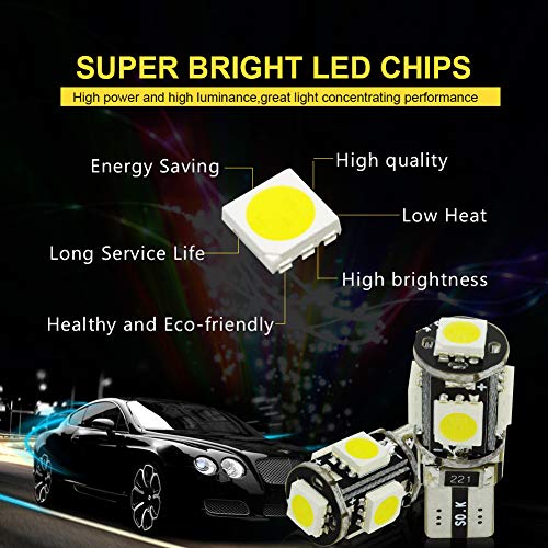 - ☛【Illuminazione 360 gradi】- W5W LED Ogni lampadina ha 5 5050 SMD su di esso, 6000K luce allo xeno bianca, angolo di illuminazione a 360 gradi, nessun punto cieco. In aggiunta ha una maggiore luminosità, una maggiore durata e un maggiore risparmio energetico.