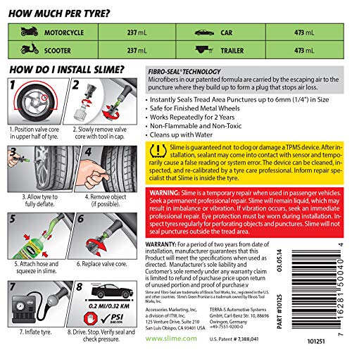 - Il sigillante pneumatici slime individua e sigilla istantaneamente le forature di dimensione massima di 6 mm nella zona battistrada utilizzando la tecnologia fibro-seal
