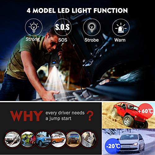 - 【4 modalità torcia a LED per la massima tranquillità】 La torcia a LED integrata ha quattro modalità (illuminazione, lampeggiante, SOS, avviso) per passare da una modalità all'altra. Il motore si avvia con successo in 3 passaggi, anche quelli che non hanno familiarità con le auto e i principianti possono facilmente avviare il motore da solo. È sicuro averlo in caso di emergenza.