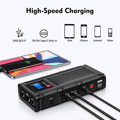 - 【RICARICA RAPIDA】La avviatore batteria auto anche un power bank con una capacità di 18000 mAh con doppia porta USB, 5 V / 2,1 A e un'interfaccia di ricarica rapida QC 3.0, è possibile utilizzare il Jump Starter per accendere i dispositivi (potenza massima 18 W) ; viene fornito con cavo di ingresso QC USB di tipo C.