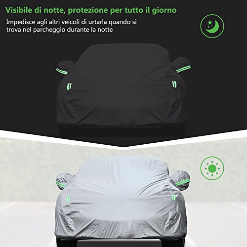 • Sicurezza h24 - Il telo è dotato di sezioni catarifrangenti, perfette per essere viste di notte. Ciò garantisce che il tuo veicolo parcheggiato sia sempre visibile agli altri automobilisti, anche di notte, proteggendo la tua auto da eventuali danni causati da altre auto.Inoltre, il telo ha cerniere laterali per un facile accesso