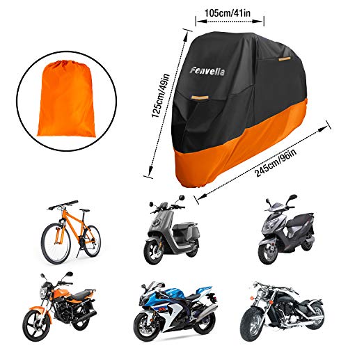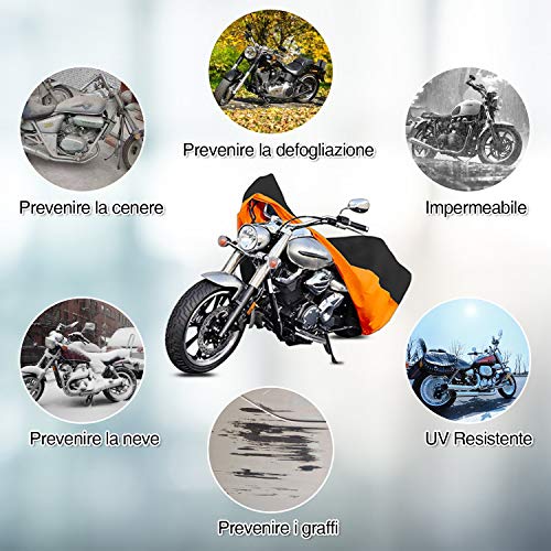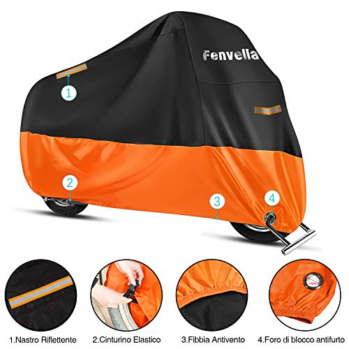 Fenvella copertura impermeabile per moto protegge la tua moto da escrementi di uccelli, polvere, pioggia e raggi UV. -Per coloro che guidano motociclette, dopo averlo posseduto, facili da guidare, non preoccuparti che la moto sia bagnata dalla pioggia, non preoccuparti della polvere che copre la moto. -Per gli appassionati di moto, hanno bisogno di una Telo Coprimoto per moto per proteggerli. Conservali come sempre nuovi. Caratteristiche: -- Materiale: Tessuto Oxford 210D -- dimensione:245 * 105 * 125cm -- Universale:Per adattarsi a molti tipi di motociclette fino a 245 cm -- Funzione: Antipolvere, Antipioggia ,UV Resistente , Antivento, impermeabile -- Colore: Nero + Arancione Pacchetto: - 1x coprimoto - 1x borsa per il trasporto Nota: - Dopo l'uso, si prega di pulire e tenerlo asciutto, quindi piegarlo e riporlo per evitare macchie.