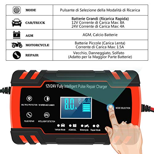 - 【Funzione di Riparazione】La tecnologia ad impulsi ad alta e bassa frequenza ha buoni effetti di riparazione e attivazione. Adatto per bombole a bassa tensione, la batteria che è rimasta inattiva per lungo tempo, solfatate per batterie. Fai clic sul pulsante di riparazione del caricatore è in grado di risolvere il problema della batteria .