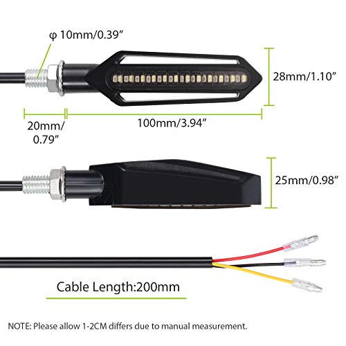 Caratteristiche:2PZ Indicatori di direzioni sono colori ambra e bianco, si possono usare come luce diurna.2PZ Indicatori di direzioni sono colori ambra e rosso, si possono usare come luce di freno.Il cool disegno rende il veicolo di alto livello e tassi di ritenzione più elevati.Adatto per moto.Specificazioni:Tipo: Indicatore di DirezioneColore: NeroCompatibilità: UniversaleMateriale: Plastica + MetalloModello di Luce LED: Flowing WaterColorazione Luce LED: Ambra & Bianco / Ambra & RossoNumero LED: 24 (2PZ: 12 LED per Ambra, 12 LED per Bianco; 2PZ: 12 LED per Ambra, 12 LED per Rosso)Connessione: 3 FiloTensione: DC 12VPotenza: 1W Ogni LampadinaDimensione: 10 x 2.8 x 2.5 cmLunghezza del Cavo: 20cmIstruzioni di Cablaggio:1. Luce Bianca & Ambra:Filo Giallo - Indicatore di DirezioneFilo Bianco - Luce DiurnaFilo Nero - Negativo2. Luce Rossa & Ambra:Filo Giallo - Indicatore di DirezioneFilo Rosso - Luce di FrenoFilo Nero - NegativoMontaggio:Questo indicatore di direzione è universale per 10MM Foro, funziona con la maggior parte delle moto come Biciclette sportive / Bici da Strada / Off Road / Chopper.Honda Tutti i Modelli & Anni (Anteriore o Posteriore)Yamaha Tutti i Modelli & Anni (Anteriore o Posteriore)Suzuki Tutti i Modelli & Anni (Anteriore o Posteriore)Kawasaki Tutti i Modelli & Anni (Anteriore o Posteriore)BMW Tutti i Modelli & Anni (Anteriore o Posteriore)DUCATI Tutti i Modelli & Anni (Anteriore o Posteriore)BUELL Tutti i Modelli & Anni (Anteriore o Posteriore)APRILI Tutti i Modelli & Anni (Anteriore o Posteriore)Pacchetto Include:2 x Indicatore di Direzione Bianco & Ambra (Per Anteriore)2 x Indicatore di Direzione Rosso & Ambra (Per Posteriore)