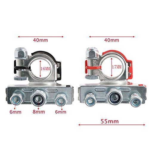 Specifiche: Materiale: rame puro. Colore: Rosso(+) e Nero (-). Quantità: 2 (1 x positivo 1 x negativo). Dimensioni totali (circa): 55 x 35 x 45 mm (LxPxA) Adatto a batterie da 6 a 12 Volt. Contenuto della confezione: 1 x set di morsetti per batterie.