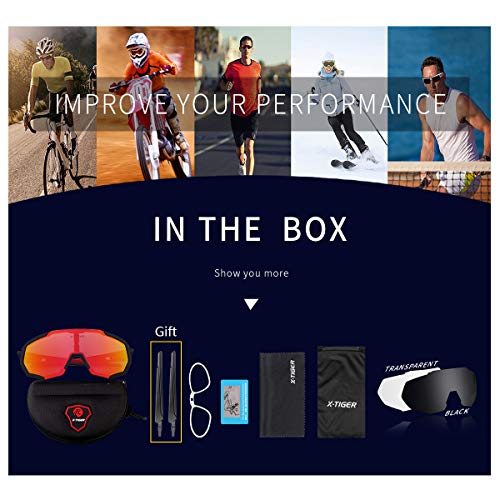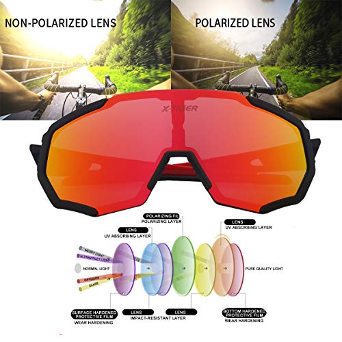 X-TIGER Occhiali Ciclismo Polarizzati con 3 Lenti Nero e Rosso