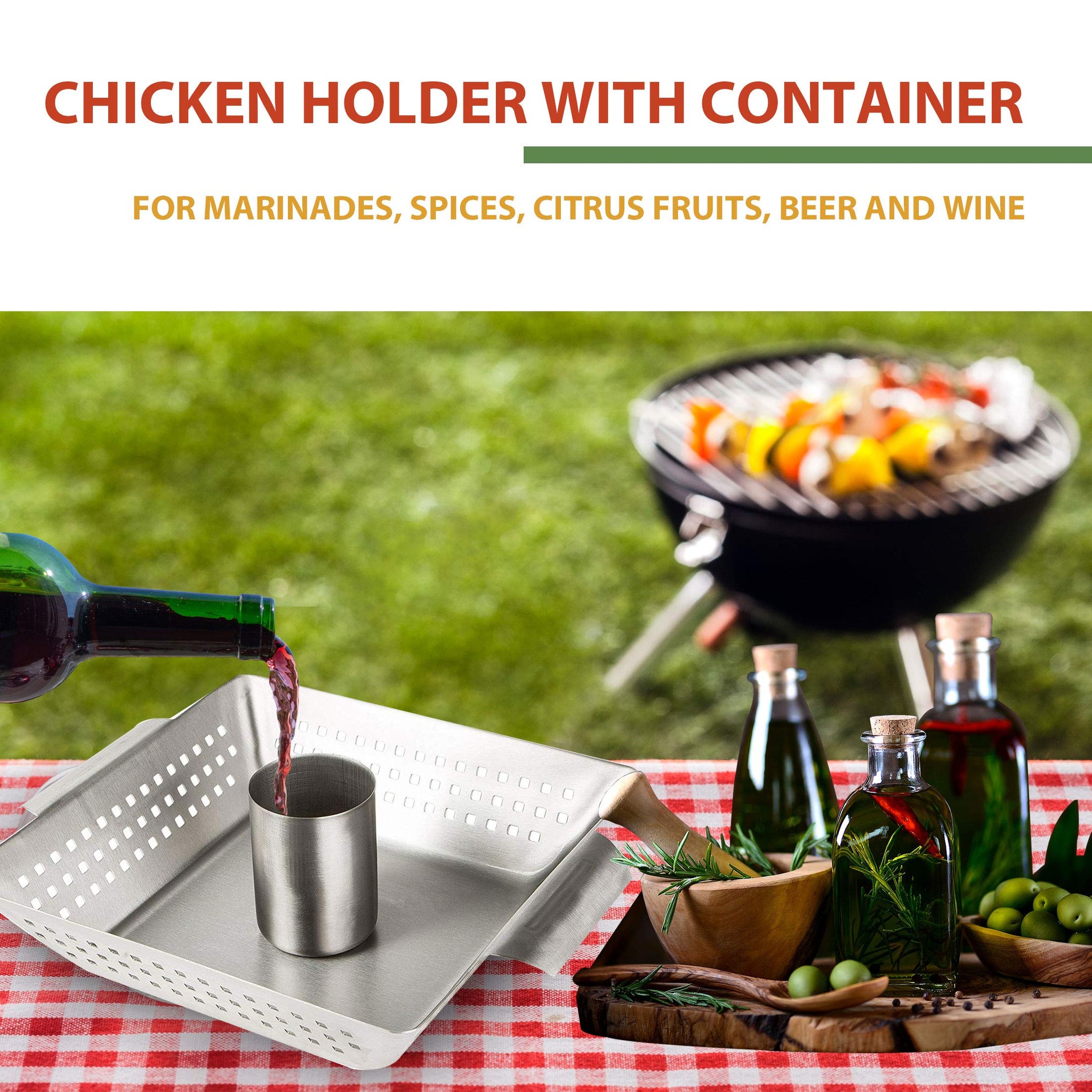 - Supporto per pollo con serbatoio per marinatura, spezie, agrumi, birra, vino e altri ingredienti aromatici